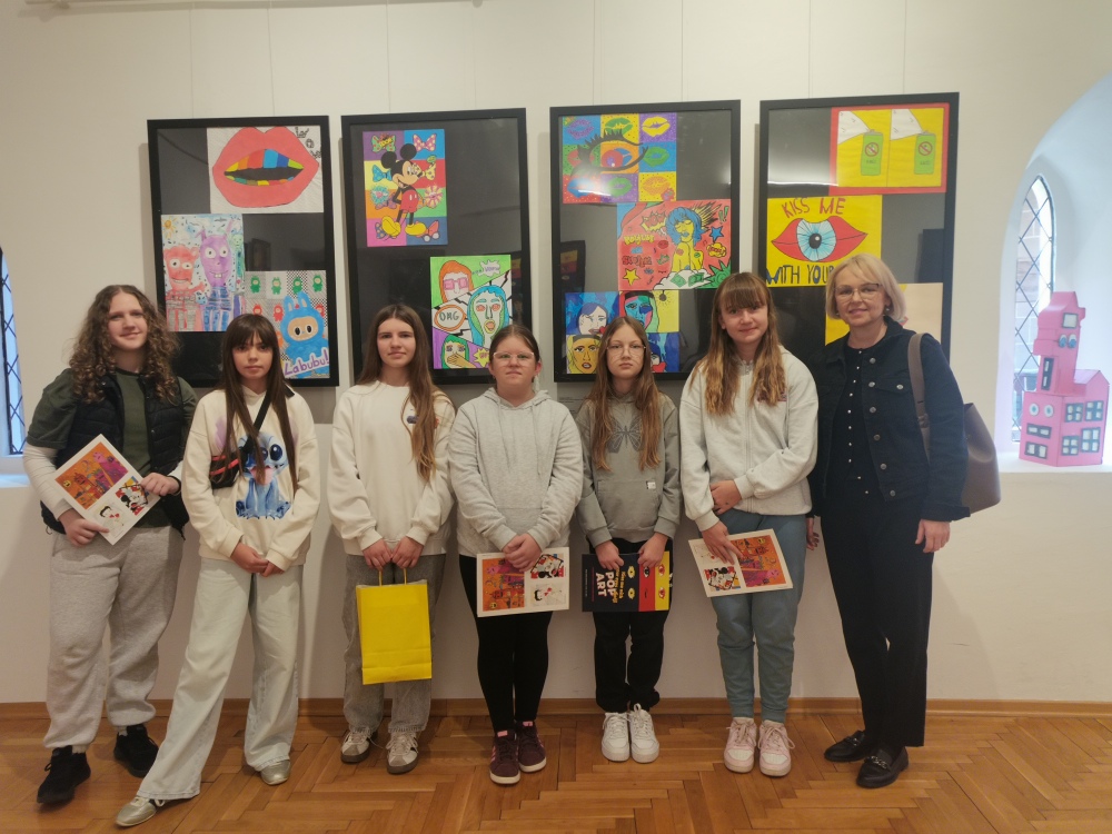 Učenice naše škole Mirjam Fičko (6.c), Dora Kovačić (6.c), Iva Šegrt (6.c), Karla Vlašić (6.c), Katja Bratanović (7.c), Sara Leona Saraja (6.) i Katja Škafar (8.b) u pratnji učiteljice likovne kulture Ive Šklebar, dana 20.10. prisustvovale su otvorenju izložbe žiriranih dječjih radova pristiglih na natječaj „Kiss me with your eyes – dječji pop art“ u prostorima Muzeja Grada Đurđevca.