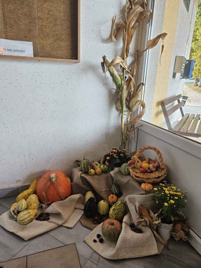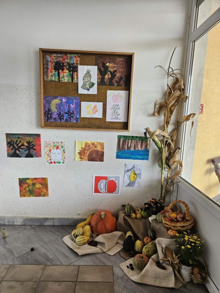 Ulaskom u našu školu ulazite u svijet jeseni. Učiteljica Ananda Glavica Ostojić uredila je predvorje ulaza u temu jeseni. Ostatci plodova zemlje, kojima smo ukrasili stolove povodom obilježavanja Dana kruha, krase ulaz naše škole. Njima smo pridružili i likovne radove učenika razredne nastave.