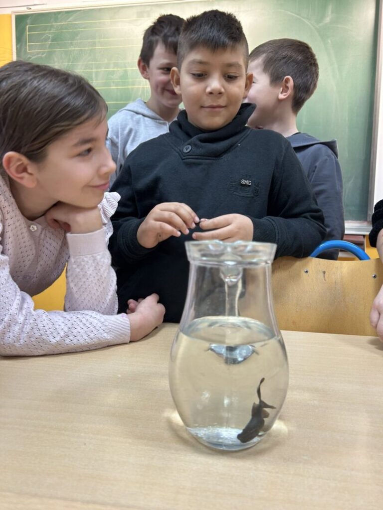 Trećaši su na satu Prirode i društva iz prve ruke promatrali živa bića te razgovarali o njihovu izgledu, staništu i prehrani. Usporedili su život u vodi i na kopnu te naglasili koliko su ljubav, briga i odgovornost važni kada se skrbi o kućnim ljubimcima. Blacky nas je podsjetila koliko je važan čist i uređen akvarij, a Rio oduševio svojom razigranošću i znatiželjom.