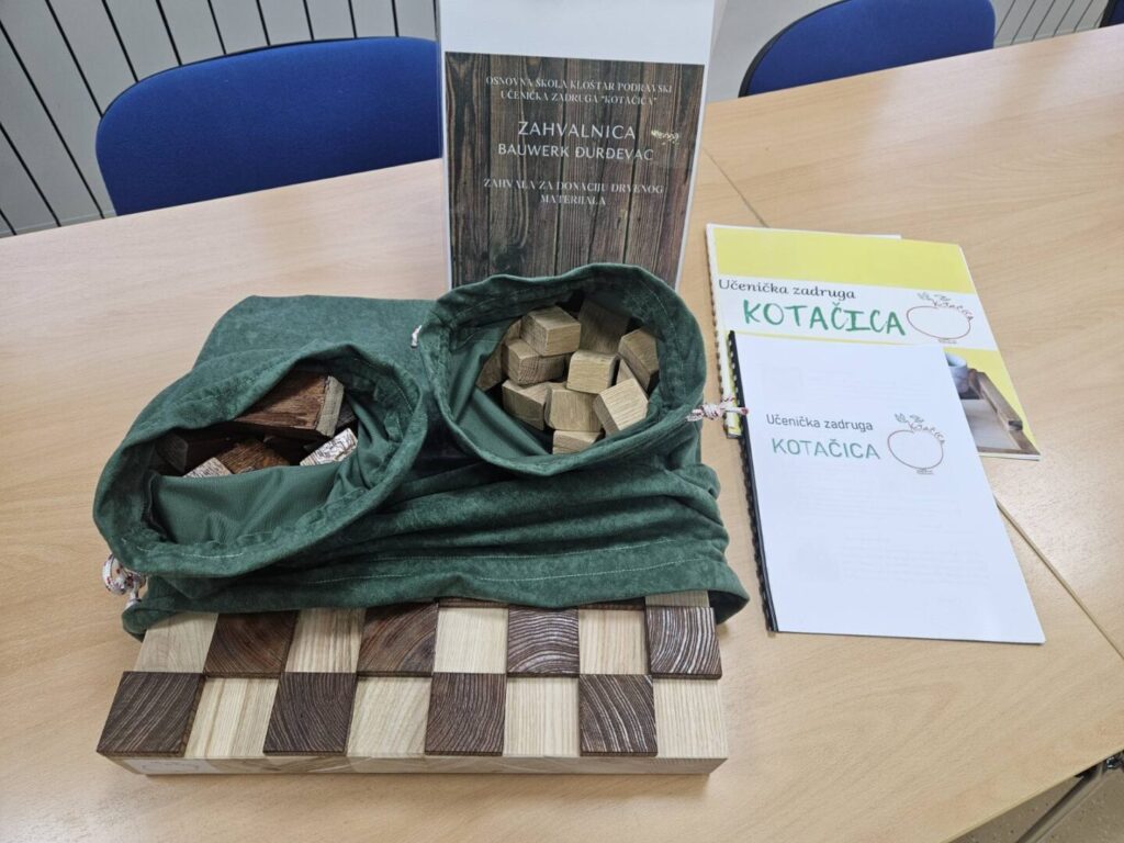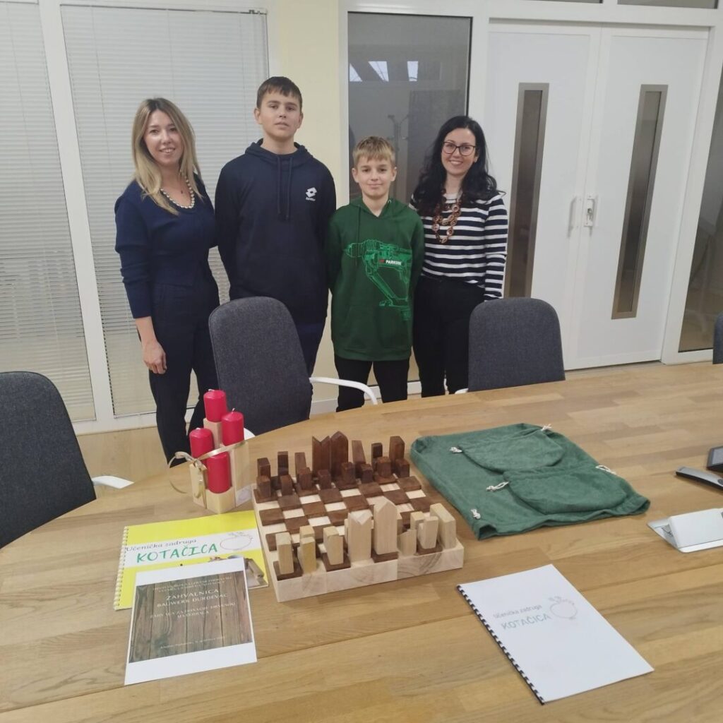 Naši učenici Šimun Đurišević i Roko Alvir u pratnji mentora Mate Alvira posjetili su tvrtku Bauwerk group iz Đurđevca. Učenici su posjetom predstavili našu školu, Učeničku zadrugu Kotačica te izvannastavnu aktivnost Mladi tehničari koju vodi učitelj Mate. Tvrtka Bauwerk je našoj školi dala donaciju drvenog materijala od kojih naši učenici rade razne stvari, a neke od njih su šah te adventski vijenac koji smo ih uručili u znak zahvale.